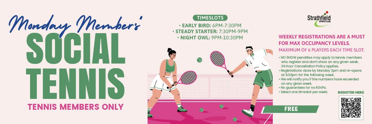 No guarantees for rock ups on the night. All cancellations and changes must be emailed to proshop@strathfieldsportsclub.com.au. Participants agree to the no show and 24 hour late cancellation penalties upon registration.