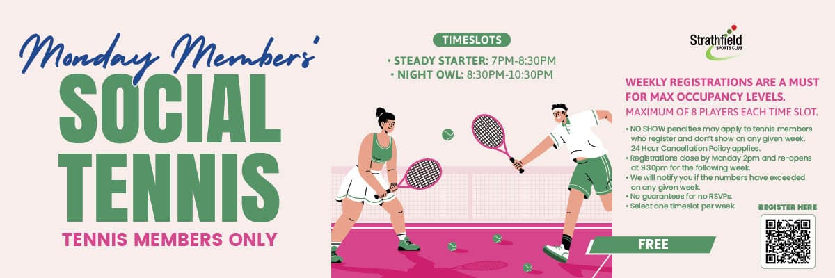 No guarantees for rock ups on the night. All cancellations and changes must be emailed to proshop@strathfieldsportsclub.com.au. Participants agree to the no show and 24 hour late cancellation penalties upon registration.